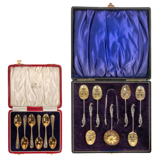 (2) cased sets of demitasse spoons including a set of (6) gold dipped by Josiah Williams & Co. and a set of (6) having gold dipped bowls, a tea strainer and sugar tongs by Blanckehsee and Sons Ltd (all marked having lion passant)
