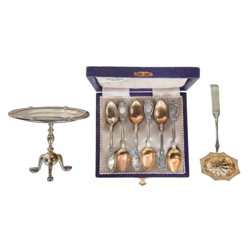 (3) items including a cased set of six demitasse spoons, a slotted spoon (marked Russian "84") and a footed card tray marked West and Sons (most marked 0.900 to 0.830 silver)
