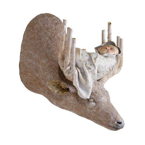 Depicting a deer having antlers culminating in faux candles, which support a sleeping infant