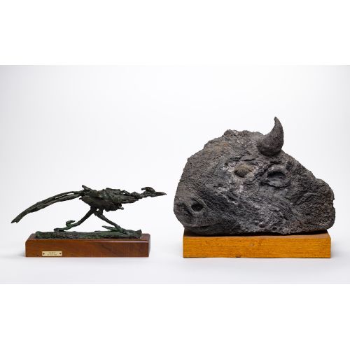 (2) total items including a bronze depiction of a roadrunner having cast signature, on wood base having brass title / artist label; together with a carved volcanic stone bison head signed "Morgan E." on the wood base
