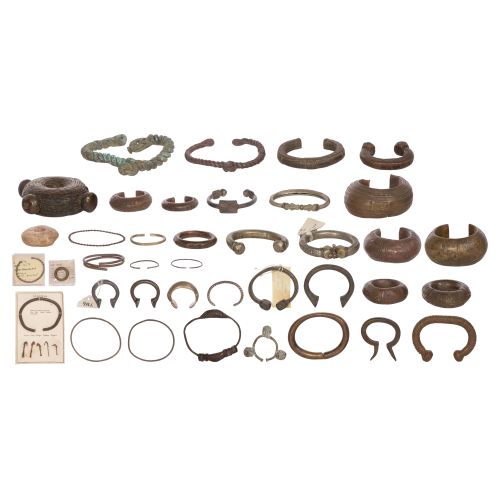 Approximately (40) total items of copper alloy or iron including a Liberian Kru or Grebo currency ring, a Lobi bell ring and various "Manilla" and other currency bracelets from tribes including Baule, Mossi, Akan, Tera, Enugu and Fulani; together with a large biconically drilled stone bead / loom weight