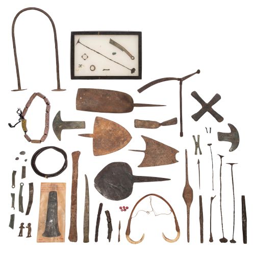 Approximately (40) total items including (3) Aztec axe monies from Mexico, (3) Larin cotter pin shape currency from India, (4) Chinese Warring States knife monies and from Africa an Igbo Manilla bracelet, (2) Katanga crosses, (4) currency blades and hoes including Mumuye and Afo, (5) Mumuye or Fulant tajere currency bars, (5) Kissi "pennies", a Nigerian parapare spatula and a Kru or Grebo currency ring; together with (2) Ashanti figural weights, (3) cowrie shell shaped weights, a Papua New Guinea boar tusk necklace, (2) trade bead necklaces, (3) loose beads, an iron arrowhead and (6) unidentified items