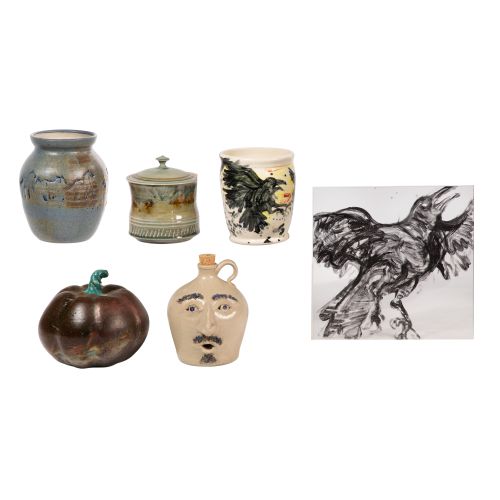 (6) total items of various forms having various glazes including a face jug and a jar having incised horse motif initialed "KD" for Karen Donleavy Designs Inc., a lidded pot signed "R. Benjamin" and an indistinctly signed pumpkin marked "Made in Peoria IL", the rest unsigned; together with a paint on acrylic depiction of a crow