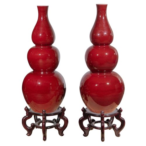 A pair of triple-gourd form vases having oxblood monochrome glaze, thinned at rims revealing white of underlying porcelain, unmarked, each vase raised 10-inches on wood stands
