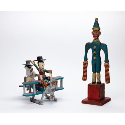 (2) total items including the biplane having figures signed "Delbert Buck" underside; together with a standing figure whirligig, initial signed and dated "KG '01" underside