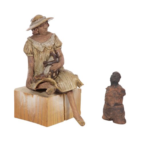 (2) items including a depiction of a seated woman cradling a pig, on a wood base, signed underside and an unsigned armless figure