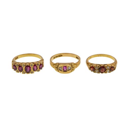 (3) items including a band style having a row of five ruby and diamond accents, a sculpted style having a center ruby flanked by two diamonds and a band style having three round cut garnets and diamond accents (marked "750" / "18k")