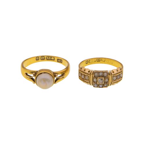 (2) items including a circular solitaire setting having an approximately 7mm cabochon pearl (marked "22") as well as a multi-stone rectangular cluster band having seed pearls and diamond center (marked "15")