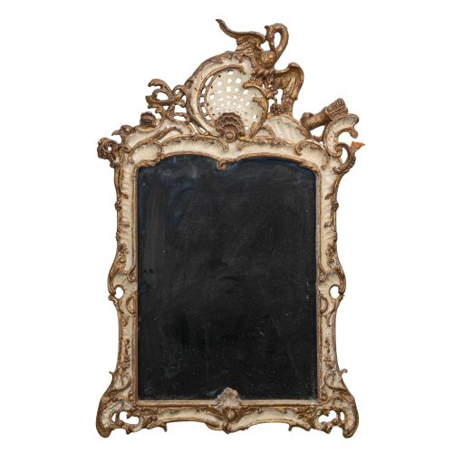 A giltwood frame having carvings of asymmetric C-scrolls and botanical foliage, a finish of plaster, white paint and gilt on gesso, a carved phoenix pediment