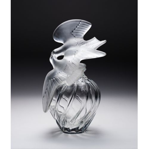 Having a dual frosted and clear conjoined doves stopper with twisted clear crystal body, marked on lower rim of bottle