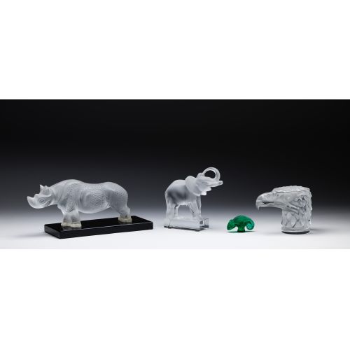 (4) items including Tete d'Aigle and elephant paperweights as well as a Toba rhinoceros on a black hard stone base and a green chameleon, all marked
