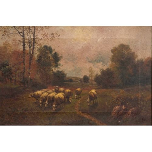 Undated, unsigned depiction of a flock of sheep in a gold-tone gesso on carved wood frame
