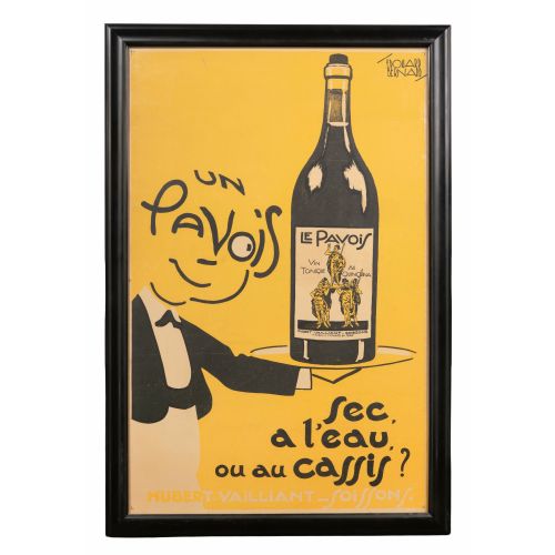 c.1934, depicting a smiling waiter holding a lage bottle on a tray his face containing the words "Un Pavois" against a yellow background, mounted on linen, under acrylic in a black wood frame, including COA
