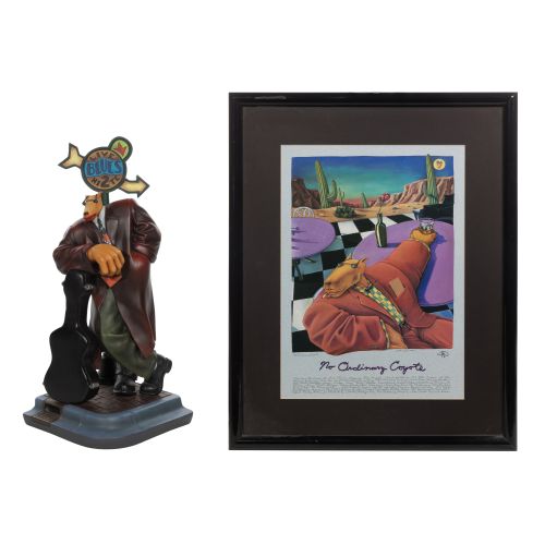 (2) items including a 1996, signed, "Miles from Nowhere" #98/185 depicting a blues musician coyote leaning against a guitar case on the street under a sign, having COA (24 x 10 x 8.5-inches) as well as a 1990 "No Ordinary Coyote" lithograph having an explanation of the coyote's date with Monique, matted under acrylic in a black wood frame