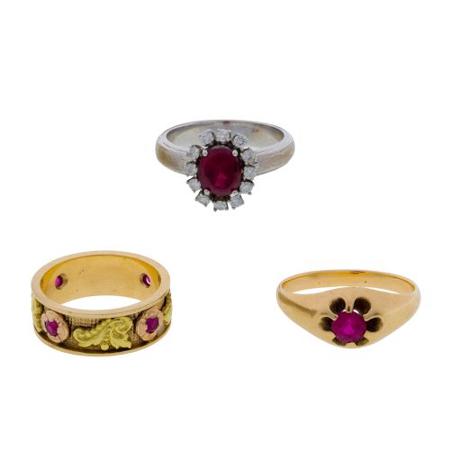 (3) items including an oval cut ruby surrounded by round cut accent diamonds, a band having embedded accent rubies and a solitaire round cut ruby (all marked "14k")