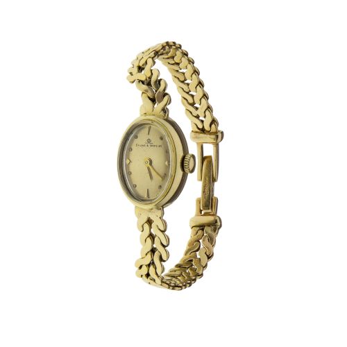 Having an oval gold-tone dial, baton hands, 17-jewel movement and integrated bracelet (all marked "14k")