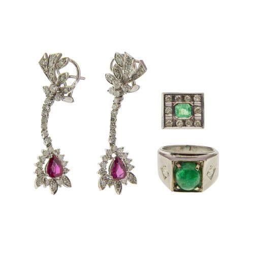 (3) items including a fragment piece having a center emerald and diamond accents (unmarked 10k) as well as a pair of fashion pierced ruby and diamond accented earrings and a green opal ring having diamond accents