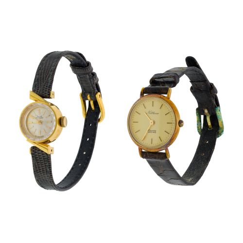 (2) items including a Grand Perregeax having a round case and champagne dial on a leather band (marked "18k" / "750" inside back of case) as well as a Noblesse having a round dial on a leather band (marked "14k" back of case)