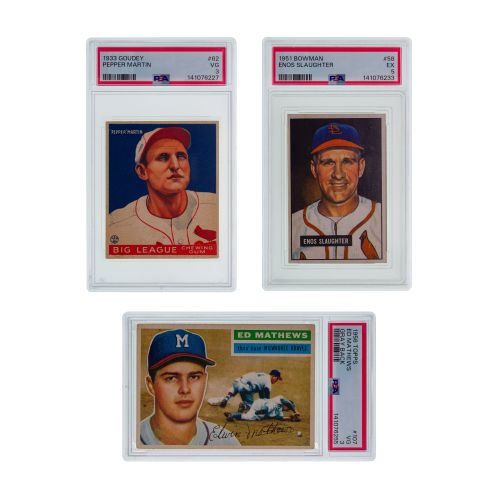 (3) items including a 1933 Goudey Pepper Martin VG-3, a 1951 Bowman Enos Slaughter EX-5 and a 1956 Topps Ed Mathews VG-3, all PSA graded
