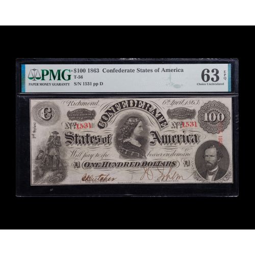 Lot #595: 1863 $100 Confederate States of America CU-63 PMG