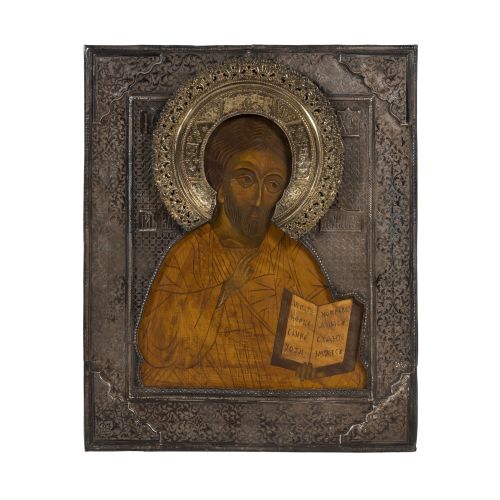 A hand painted wood panel icon of Christ Pantocrator behind a hallmarked, engraved silver oklad having attached pierced repousse halo and unidentified maker mark "HD", dated "1875" assay mark, "84" and unidentified town mark, retaining a Barbara and Richard Kaszuba Antiques, London label verso