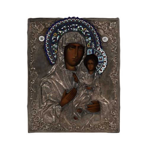 A hand painted wood panel icon of the Mother of God behind a repousse and engraved silver oklad having attached pierced repousse halo and enamel decoration, unidentified hallmarks