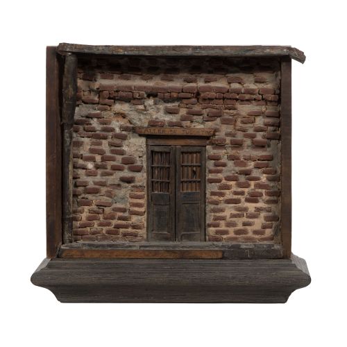 Undated, unsigned representation of a jail house having a sign over the door reading "Jaller de Juguetes" (Jailer of Toys) constructed of pottery bricks and mortar having wood details in a wood box, an inscription reading "Fabricante de Suenos diminute y alegrias primeras Santiago 1907" along lower front edge, including a bracket shelf for display