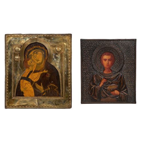 (2) items including a Holy Great Martyr Panteleimon having an embossed copper-tone oklad and a depiction of Mary with the Christ Child having a brass oklad