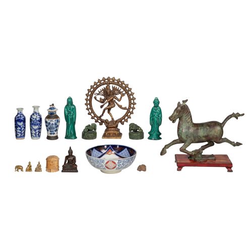 (16) items including a bronze-tone metal horse sculpture on wood stand, a brass Shiva icon, an Imari style porcelain bowl, a green glaze statue set, a set of carved green stone foo lions, a carved soapstone incense burner, a resin seated Buddha, (2) floral motif white and blue painted bud vases, a small lidded urn, (2) miniature brass Buddhas, a small brass elephant and a rock specimen