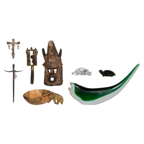(8) items including a Steuben crystal recumbent cat, a zebra themed carved wood and gourd bowl, a carved stone turtle, a tribal face mask, an iron crucifix, a pectoral cross having inlaid stones, an Ethiopian Orthodox Coptic sistrum rattle and an art glass jumping fish