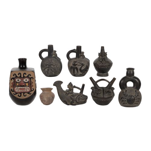 (8) items including (6) various vessels and vases in Chimu black-ware, a portrait vessel and four-sided vase of Ai Paec, some signed on underside
