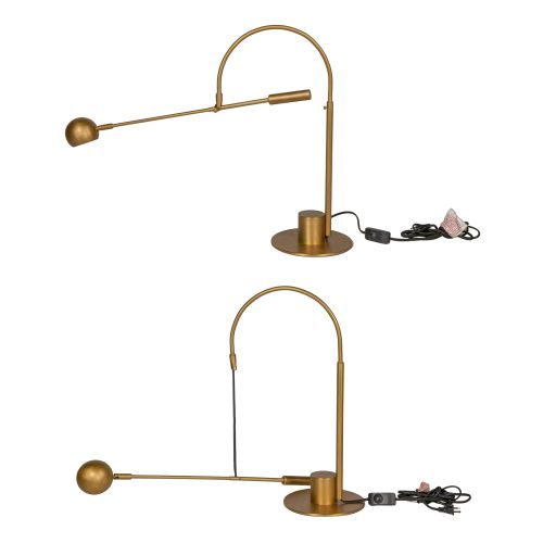 A pair of gold-tone finish metal having counter-balanced cantilever adjustable arms supported on adjustable standards (38-inch maximum height) having arching tops, ball joint adjustable spherical halogen fixtures, dimmer switch on cords, Sonneman and "Made in China" labels underside