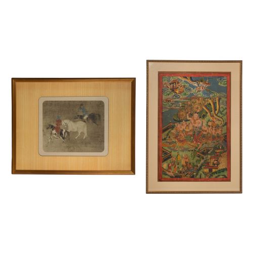 Undated, unsigned, depicting deities and immortals, in a gold-tone wood frame; together with a tribute horse-themed print