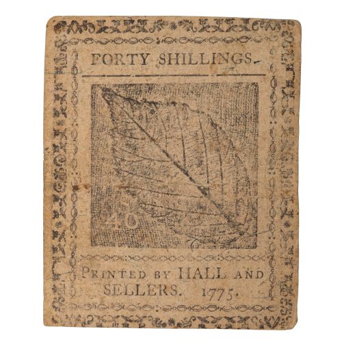 A Forty Shillings banknote from the colonial era, specifically printed in 1775 by the firm of Hall and Sellers in Pennsylvania