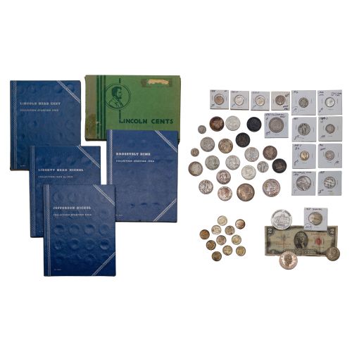 $12.95 face value US 90% silver including (2) Morgan $1, (4) Columbian Exposition 50c, (3) Barber 50c, (2) 1925 Stone Mountain 50c, (2) Walking Liberty, (5) Franklin 50c, (2) Kennedy 50c, (3) Standing Liberty 25c, (3) Barber 10c, (7) Mercury 10c and a Roosevelt 10c, a US 40% silver Kennedy 50c, (11) US 35% silver war nickels, partial coin folders including a Liberty 5c, Jefferson 5c and (2) Wheat 1c, an empty Roosevelt 10c folder as well as an Illinois State Historical Society 0.500 silver medal, a Lincoln Heritage Trail 0.999 silver medal and 1953-B $2 bill