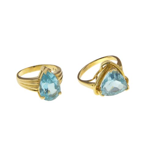 (2) cocktail rings including an approximately 14mm x 10mm pear cut and an approximately 11mm x 11mm trillion cut (all marked "14k")