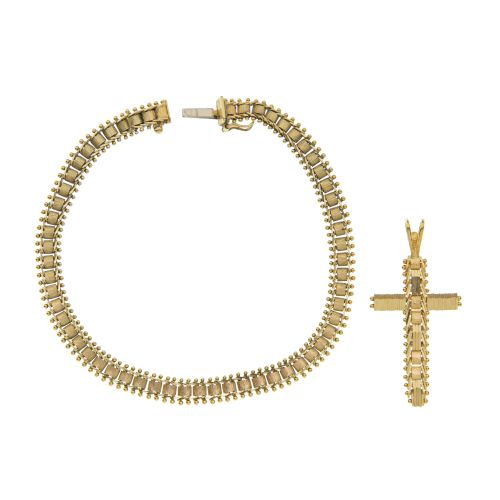 (2) items including a railroad style link bracelet and matching cross pendant (both marked "14k")