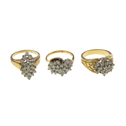 (3) items, all having a cluster design of round cut diamonds in various shaped settings (all marked "14k")