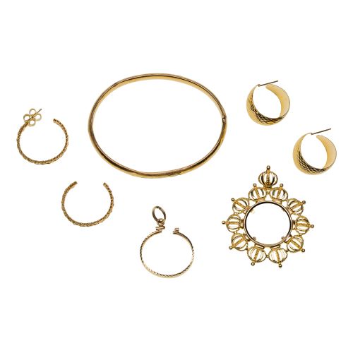 (5) items including (2) pairs of pierced earrings, a hinged bangle bracelet and (2) coin bezels (most marked "14k")