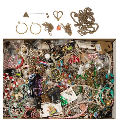 Approximately (19) pounds of necklaces, pendants, bracelets, pins, rings, earrings and (2) floral themed heart-shape jewelry trinket dishes