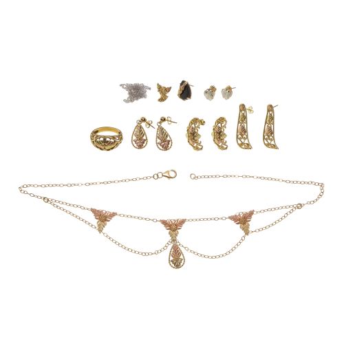 (10) items including (4) pairs of pierced earrings, (2) single earrings, a ring and a necklace as well as (2) chain fragments (most marked "10k")