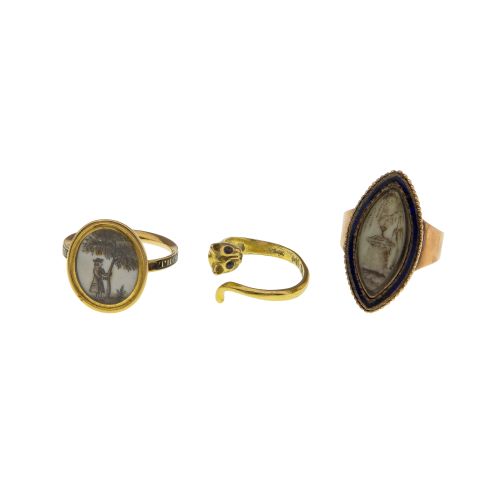 (3) items including a round mourning style having an inscription on the shank and a crossover style cat design (both marked "18k") and a boat shaped mourning style (unmarked 10k) including ring box