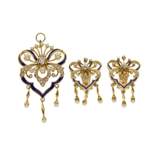 Lot #381: 14k Yellow Gold, Pearl, Enamel and Diamond Jewelry Suite