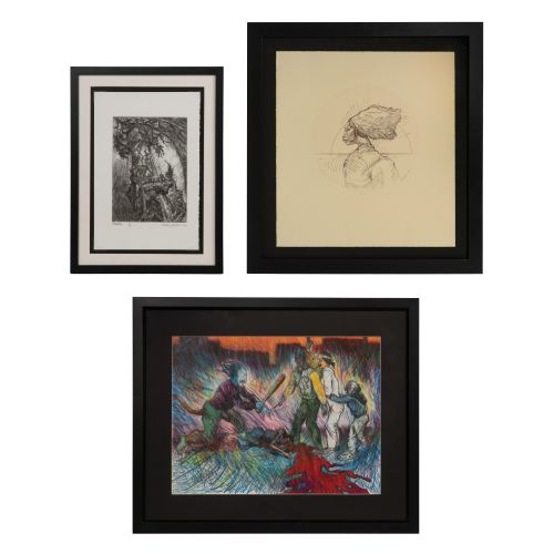 (3) works including a 1989, signed, crayon and ink depicting a gang beating, an undated, signed, "Sundowner" etching, #7/9, and a 2016, signed, "Trelis" etching, #4/10, all in black lacquer wood frames